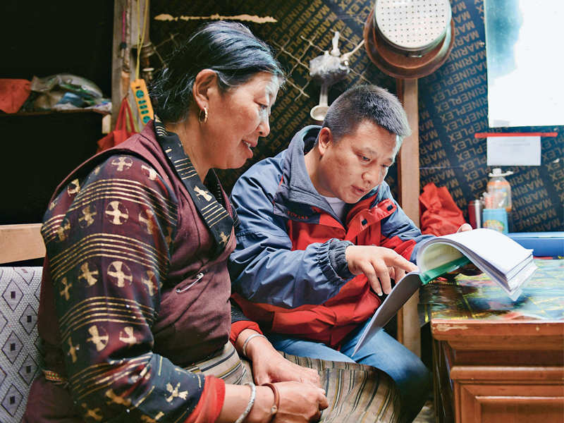 党的十八大以来,围绕全民覆盖、人人享有社会保障的目标,我国通过实施全民参保计划,精准推进重点群体参保,建立了世界上覆盖人数最多的社会保障体系。图为2018年5月24日,西藏山南市社保工作人员在玉麦乡玉麦村村民家中,进行社保信息补充登记。 新华社记者 晋美多吉/摄